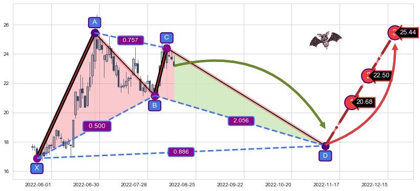 ➣ 未完成【蝙蝠】形态起点X: 2022-05-24, 已到达C点: 2022-08-09, 预测最终D点: 2022-11-09, 共121交易日