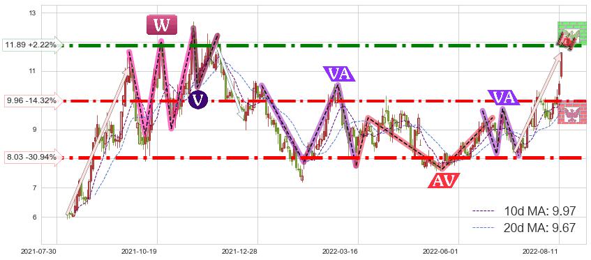 ♘ 阻力价格位11.89,可信任强度93.99%,距离最后交易2022-08-12形成的收盘价格11.63相差 +2.22%