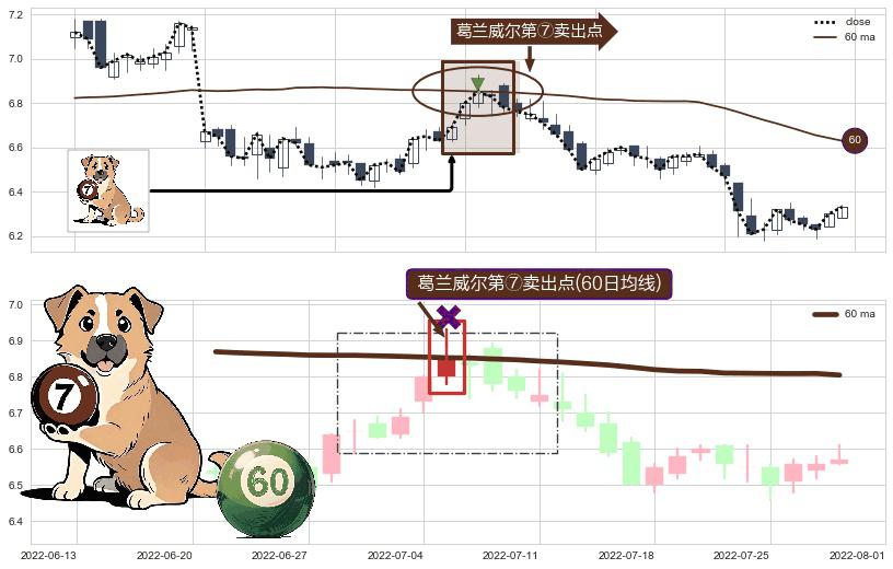 形态多维评估: ⚀ 2022-07-05-日显现 葛兰威尔均线 60日均线 第⑦卖出点 下降趋势的中继信号,后市看跌,卖出信号