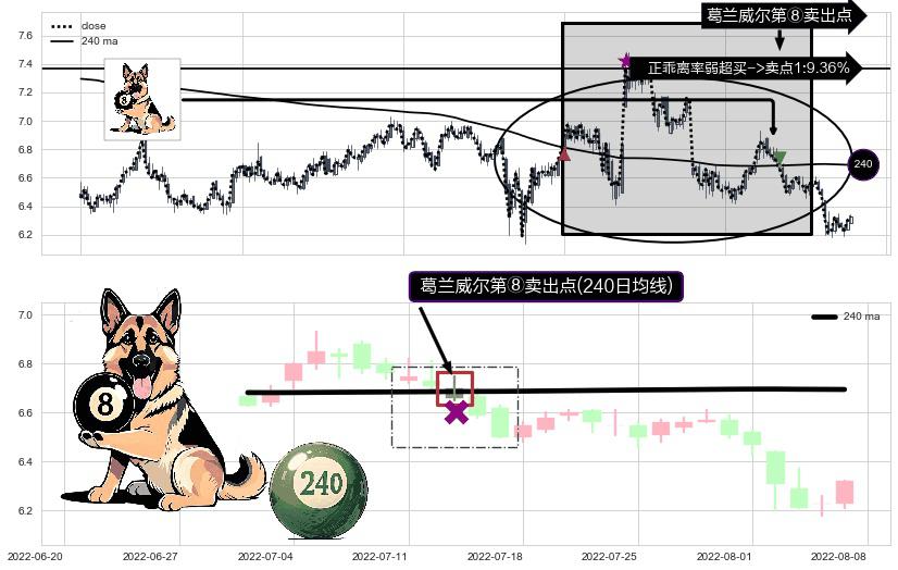 形态多维评估: ⚀ 2022-07-13-日显现 葛兰威尔均线 240日均线 第⑧卖出点 下降趋势的中继信号,后市看跌,卖出信号