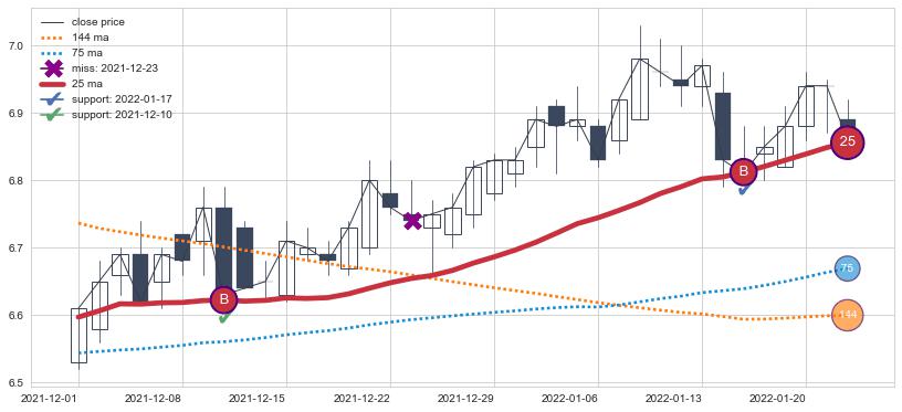 上涨趋势2021-12-01-2022-01-24,均线25确认关键支撑2处