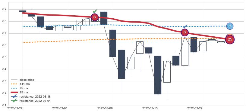下跌趋势2022-02-22-2022-03-25,均线25确认关键阻力2处