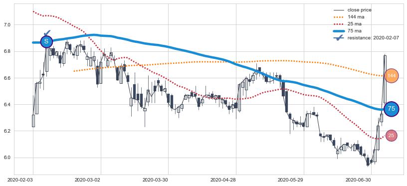 下跌趋势2020-02-03-2020-07-06,均线75确认关键阻力1处