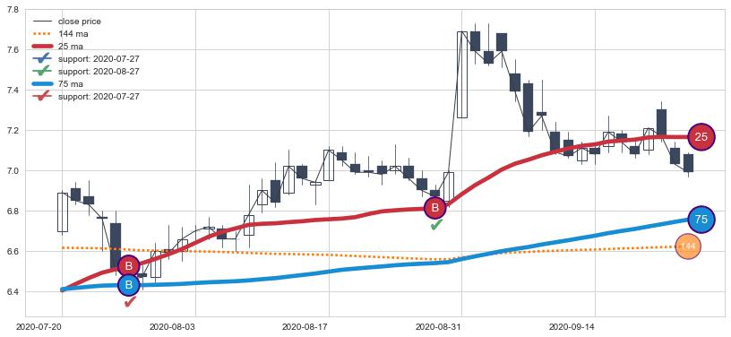 上涨趋势2020-07-20-2020-09-23,均线25, 75确认关键支撑2处
