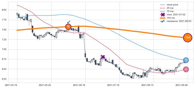 下跌趋势2021-04-19-2021-09-08,均线144确认关键阻力1处