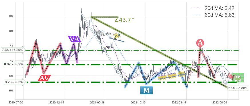 ♘ 阻力价格位7.36,可信任强度68.21%,距离最后交易2022-08-12形成的收盘价格6.33相差 +16.29%