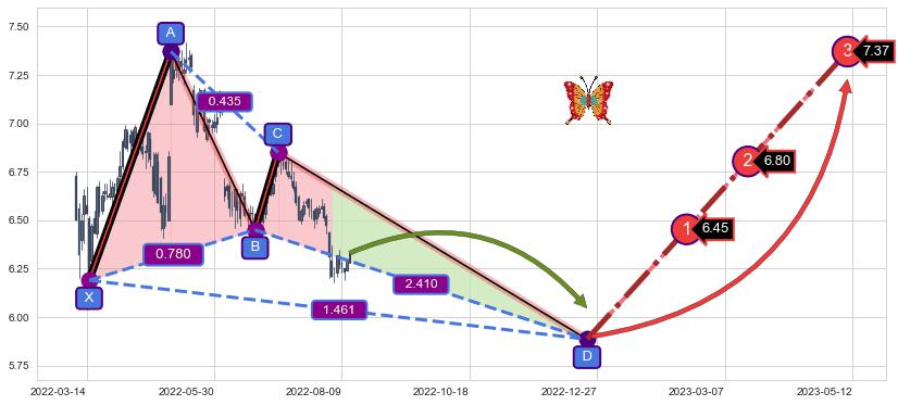 ➣ 未完成【蝴蝶】形态起点X: 2022-03-15, 已到达C点: 2022-07-05, 预测最终D点: 2022-12-21, 共189交易日