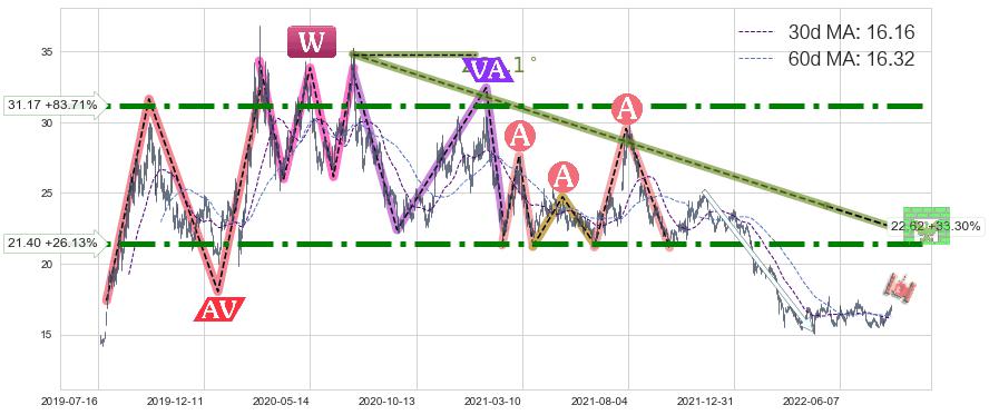 ♘ 阻力价格位31.17,可信任强度97.50%,距离最后交易2022-08-12形成的收盘价格16.97相差 +83.71%
