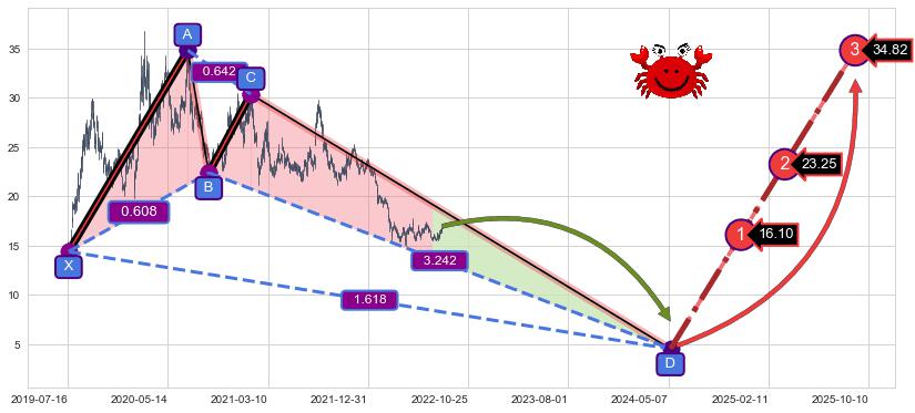 ➣ 未完成【螃蟹】形态起点X: 2019-07-18, 已到达C点: 2021-01-14, 预测最终D点: 2024-05-13, 共1183交易日