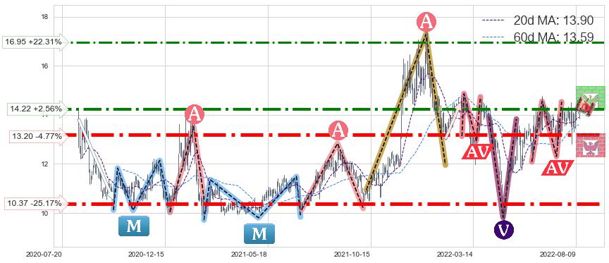♘ 阻力价格位14.22,可信任强度74.68%,距离最后交易2022-08-12形成的收盘价格13.86相差 +2.56%
