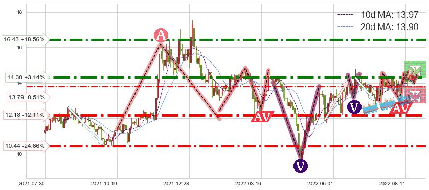 ♘ 阻力价格位14.30,可信任强度90.52%,距离最后交易2022-08-12形成的收盘价格13.86相差 +3.14%
