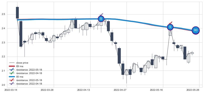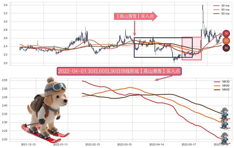 ⚀ 2022-01-24日-2022-06-09日显现 30日-60日-90日均线 【高山滑雪】买入点 看多信号,后市看涨,买入