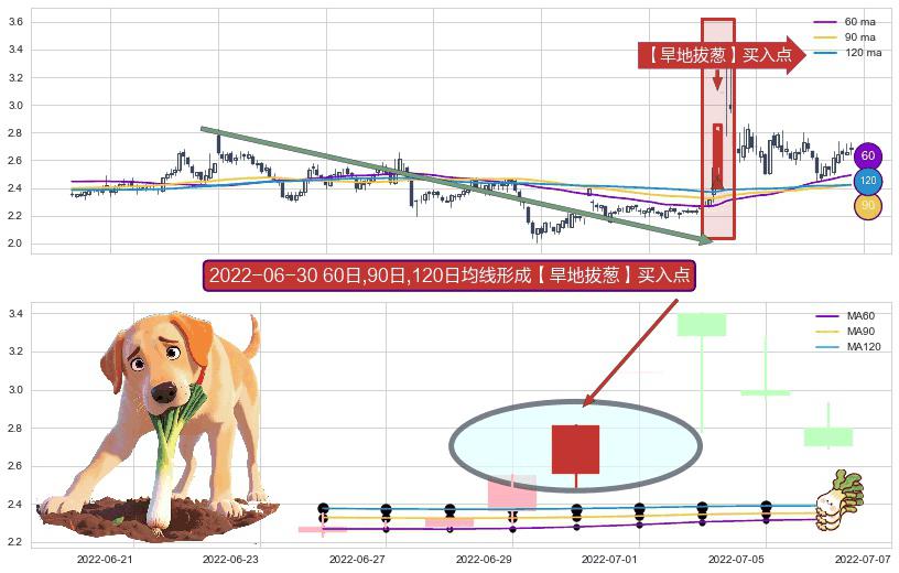 ⚀ 2022-06-30日显现 60日-90日-120日均线 【旱地拔葱】买入点 看多信号,后市看涨,买入