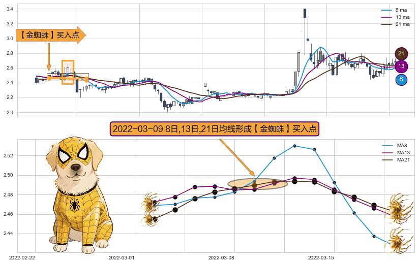 ⚀ 2022-03-09日显现 8日-13日-21日均线 【金蜘蛛】买入点 看多信号,后市看涨,买入