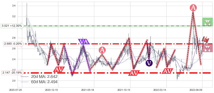 ♘ 支撑价格位2.147,可信任强度99.00%,距离最后交易2022-08-12形成的收盘价格2.690相差 -20.19%