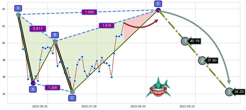 ➣ 未完成【鲨鱼】形态起点X: 2022-06-14, 已到达C点: 2022-07-14, 预测最终D点: 2022-09-01, 共58交易日