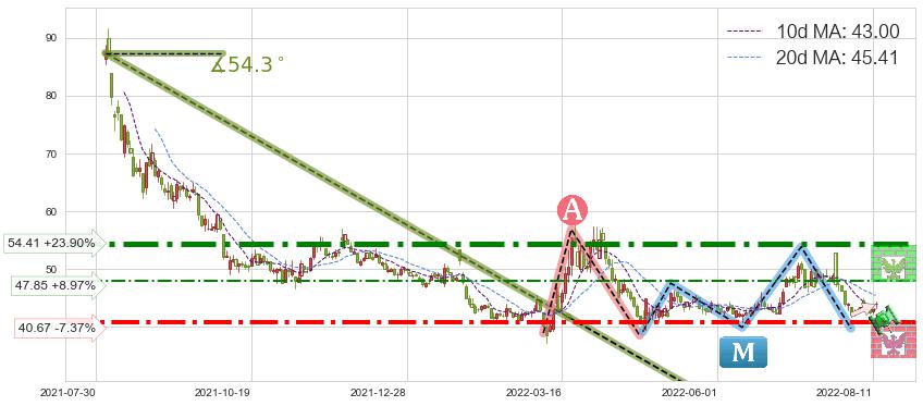 ♘ 阻力价格位47.85,可信任强度54.19%,距离最后交易2022-08-12形成的收盘价格43.91相差 +8.97%