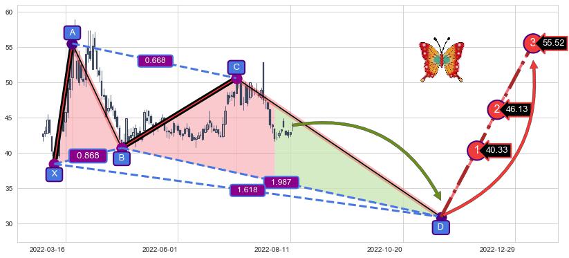 ➣ 未完成【蝴蝶】形态起点X: 2022-03-09, 已到达C点: 2022-07-08, 预测最终D点: 2022-11-14, 共165交易日