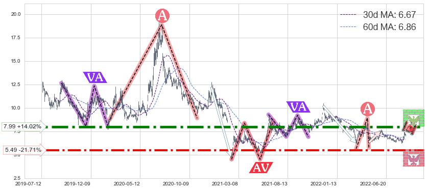 ♘ 阻力价格位7.99,可信任强度91.33%,距离最后交易2022-08-12形成的收盘价格7.01相差 +14.02%