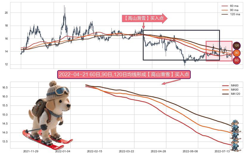 形态多维评估: ⚀ 2022-01-20日-2022-07-15日显现 60日-90日-120日均线 【高山滑雪】买入点 看多信号,后市看涨,买入