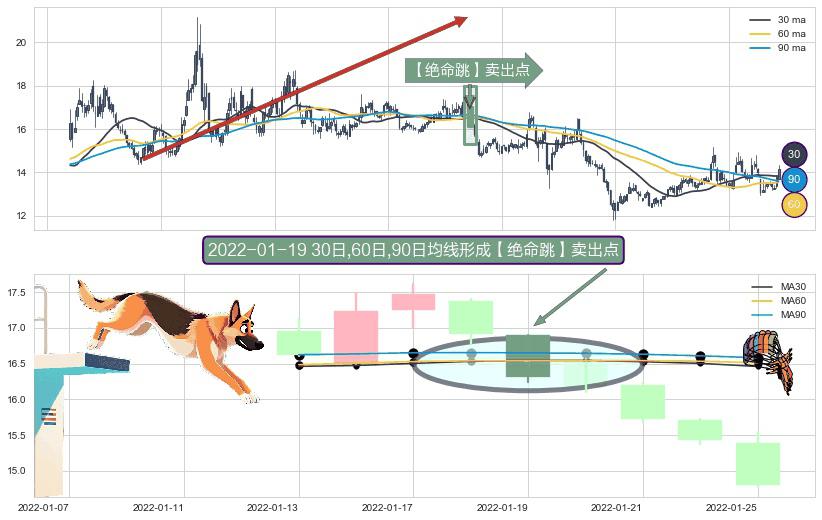 形态多维评估: ⚀ 2022-01-19日显现 30日-60日-90日均线 【绝命跳】卖出点 看空信号,后市看跌,卖出