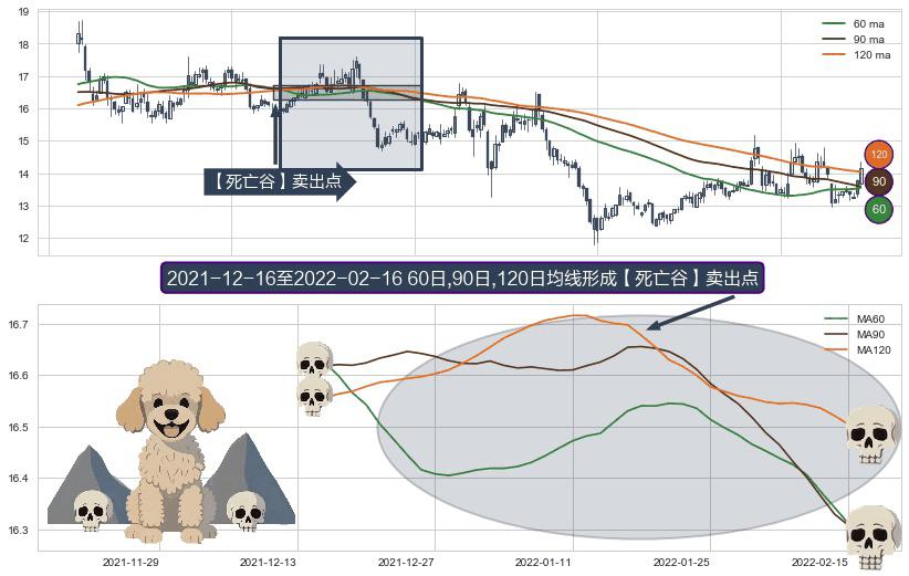 形态多维评估: ⚀ 2021-12-17-日至2022-02-16-日显现 60日-90日-120日均线 【死亡谷】卖出点 看空信号,后市看跌,卖出