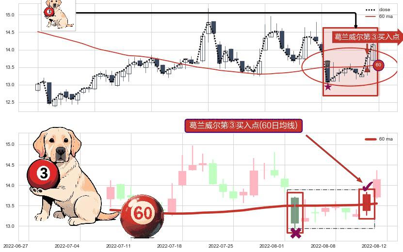 形态多维评估: ⚀ 2022-08-11-日显现 葛兰威尔均线 60日均线 第③买入点 上升趋势的中继信号,后市看涨,买进信号