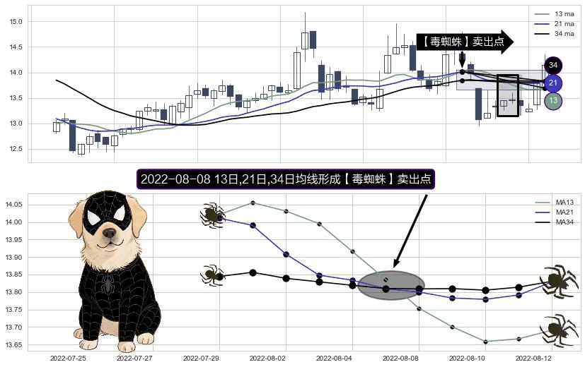 形态多维评估: ⚀ 2022-08-08日显现 13日-21日-34日均线 【毒蜘蛛】卖出点 看空信号,后市看跌,卖出