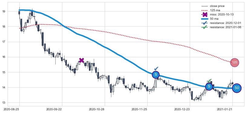 下跌趋势2022-02-23-2022-06-07,均线125确认关键阻力2处