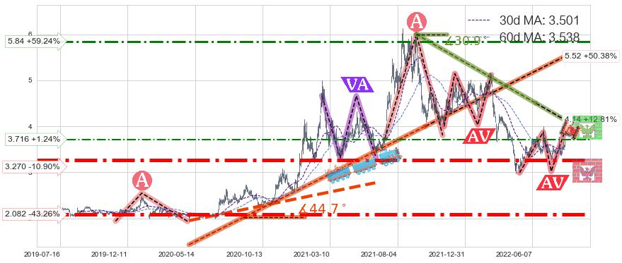♘ 阻力价格位3.716,可信任强度53.68%,距离最后交易2022-08-12形成的收盘价格3.670相差 +1.24%