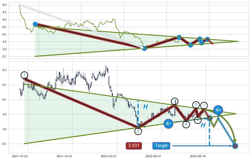 ➣ 【未确认突破,预测即将形成突破】下降【对称】三角形整理起点:2021-10-18, 预测突破点:2022-08-22,形态共209交易日