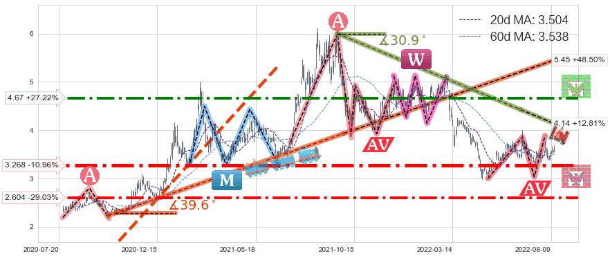 ♘ 支撑价格位3.268,可信任强度91.71%,距离最后交易2022-08-12形成的收盘价格3.670相差 -10.96%