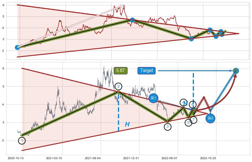 ➢ 最小中继整理涨幅→𝐇: 2.195 (高点逐步降低斜边第一阻力点②与支撑边垂直距离)