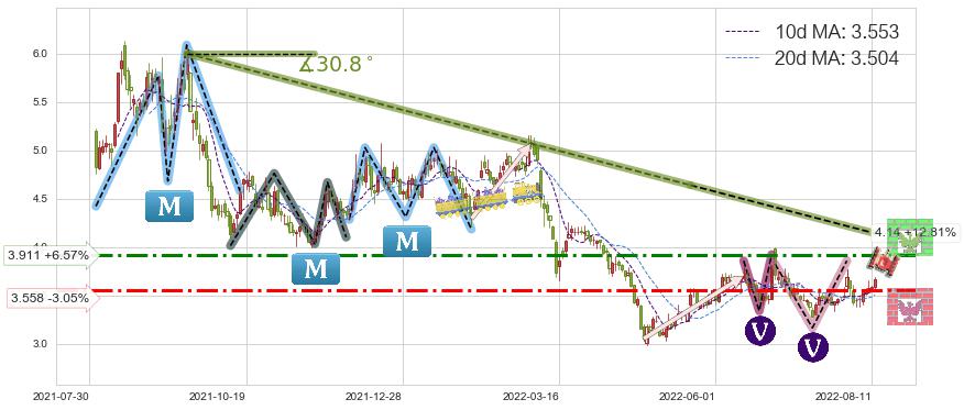 ♘ 阻力价格位3.911,可信任强度64.56%,距离最后交易2022-08-12形成的收盘价格3.670相差 +6.57%