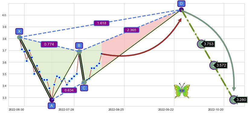 ➣ 未完成【蝴蝶】形态起点X: 2022-06-28, 已到达C点: 2022-08-03, 预测最终D点: 2022-09-27, 共66交易日