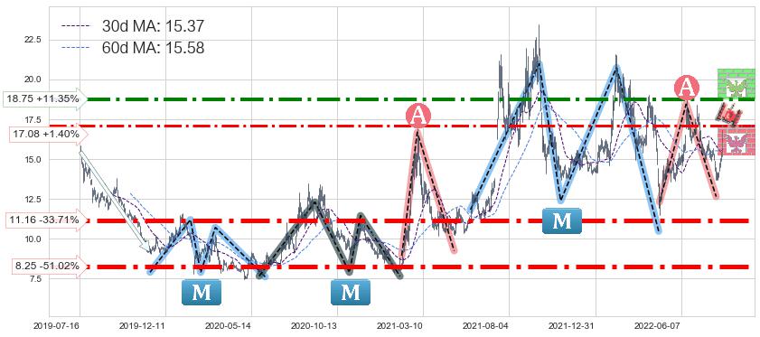 ♘ 阻力价格位18.75,可信任强度75.28%,距离最后交易2022-08-12形成的收盘价格16.84相差 +11.35%