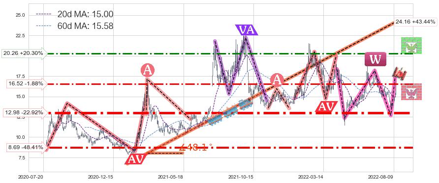 ♘ 阻力价格位20.26,可信任强度69.44%,距离最后交易2022-08-12形成的收盘价格16.84相差 +20.30%