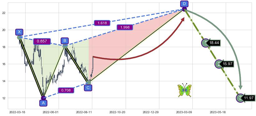 ➣ 未完成【蝴蝶】形态起点X: 2022-03-03, 已到达C点: 2022-08-03, 预测最终D点: 2023-02-21, 共242交易日