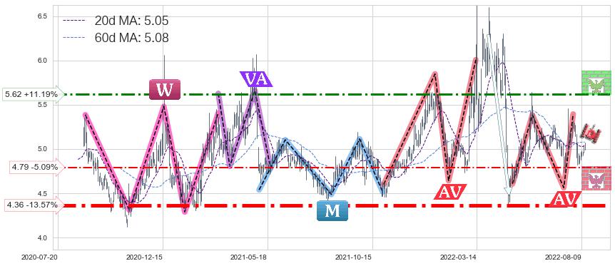 ♘ 阻力价格位5.62,可信任强度66.00%,距离最后交易2022-08-12形成的收盘价格5.05相差 +11.19%