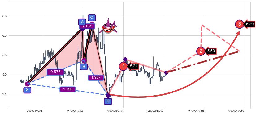 ➣ 已完成【鲨鱼】形态起点X: 2021-11-29, 终点D: 2022-04-28, 共101交易日