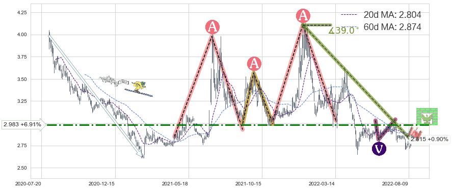 ♘ 阻力价格位2.983,可信任强度66.14%,距离最后交易2022-08-12形成的收盘价格2.790相差 +6.91%