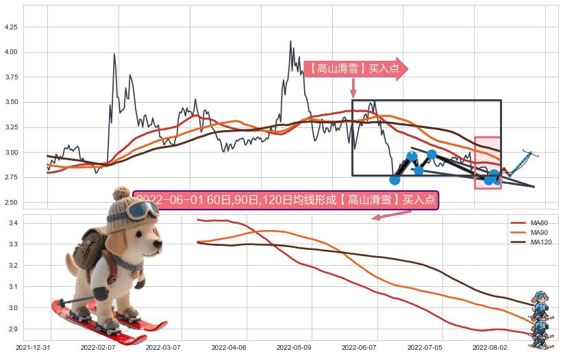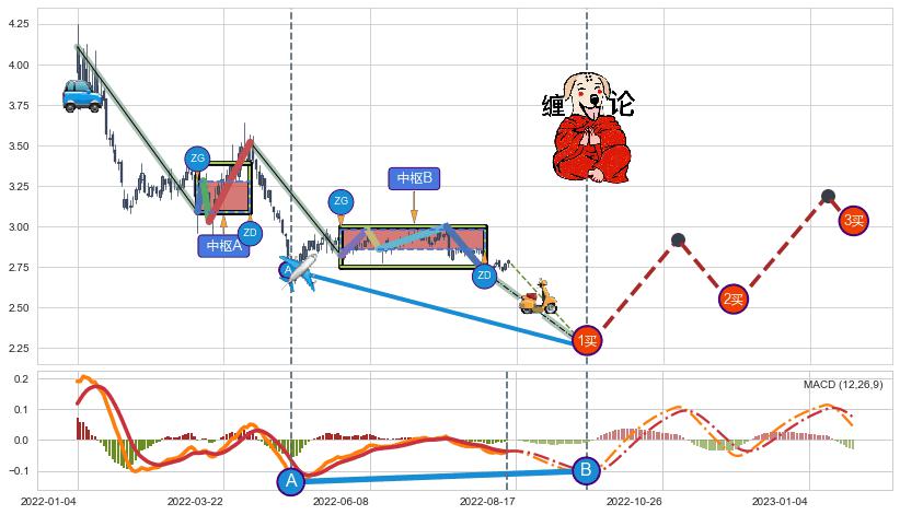 ➢ 【中枢B】:2022-05-24-2022-08-02,中枢由5笔构成,共50交易日, ZG=2.980, ZD=2.860