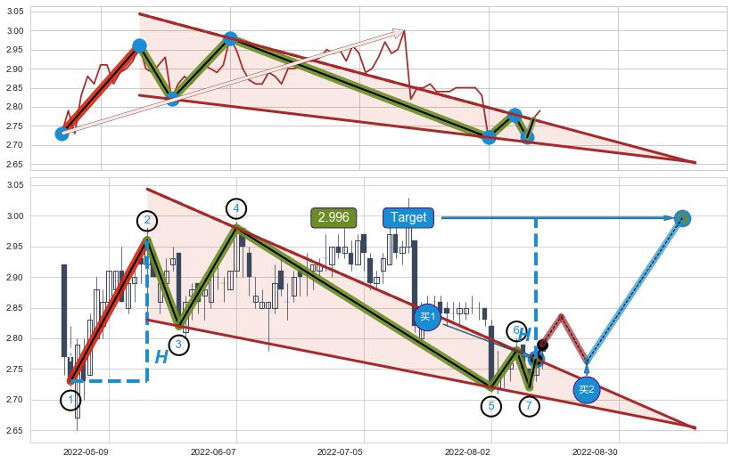 ➢ 【买1】: 激进型 买点 →(2022-08-11: 2.766 )形成突破降🚩楔型【整理】形态
