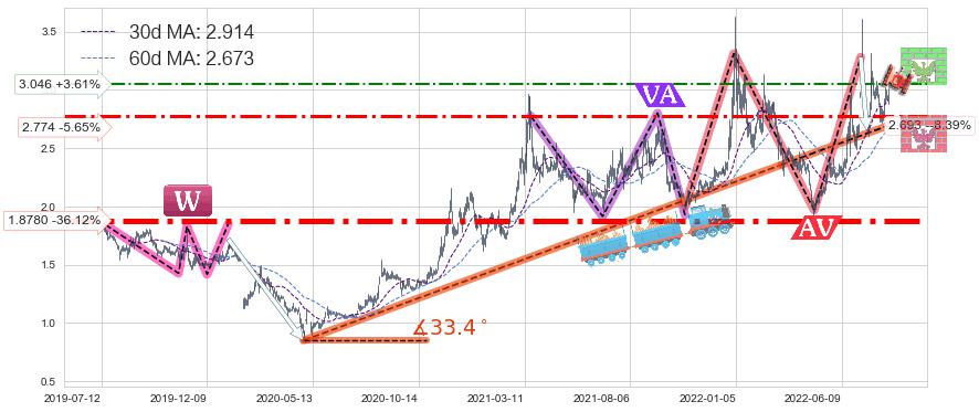 ♘ 阻力价格位3.046,可信任强度54.81%,距离最后交易2022-08-12形成的收盘价格2.940相差 +3.61%