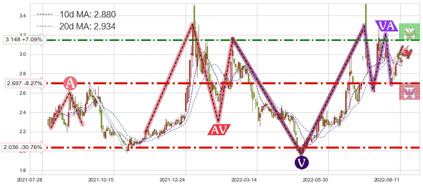 ♘ 阻力价格位3.148,可信任强度66.13%,距离最后交易2022-08-12形成的收盘价格2.940相差 +7.09%