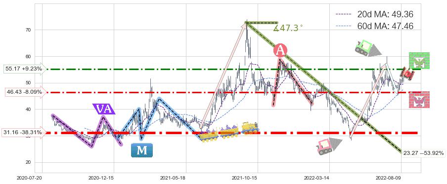 ♘ 支撑价格位46.43,可信任强度62.59%,距离最后交易2022-08-12形成的收盘价格50.51相差 -8.09%