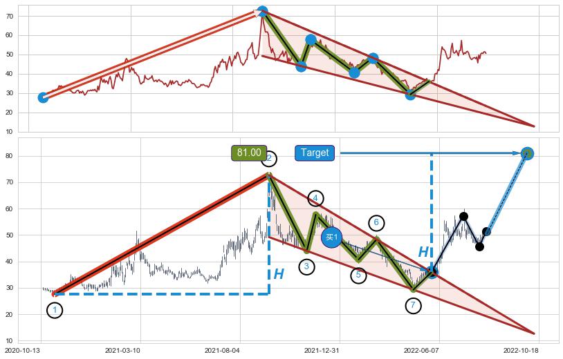 ➢ 最小中继整理涨幅→𝐇: 45.09 (𝐇楔型旗杆的长度:楔型起点→顶点)