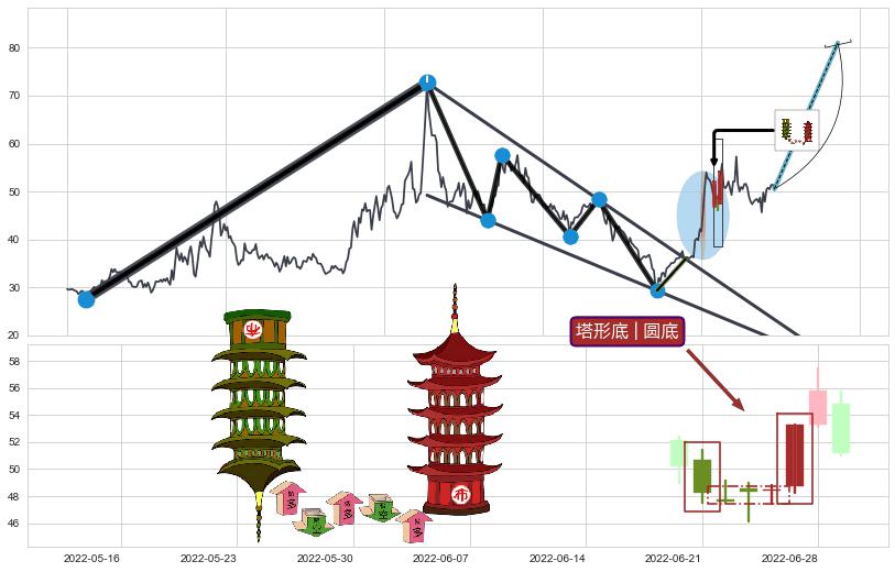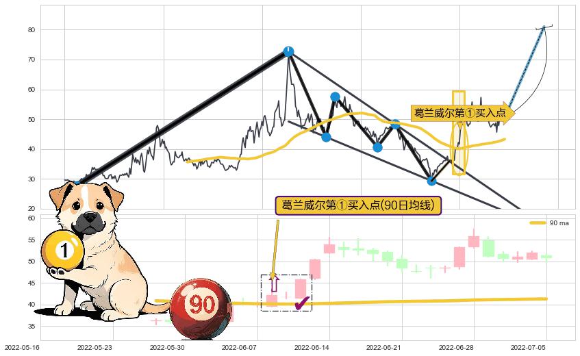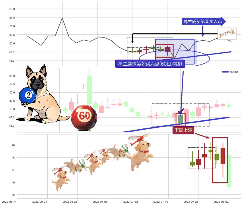 ➢ 收盘价(2022-06-22: 47.62 )→再次回踩→第一根k线高点(2022-06-13: 50.44 )