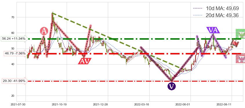♘ 阻力价格位56.24,可信任强度93.11%,距离最后交易2022-08-12形成的收盘价格50.51相差 +11.34%
