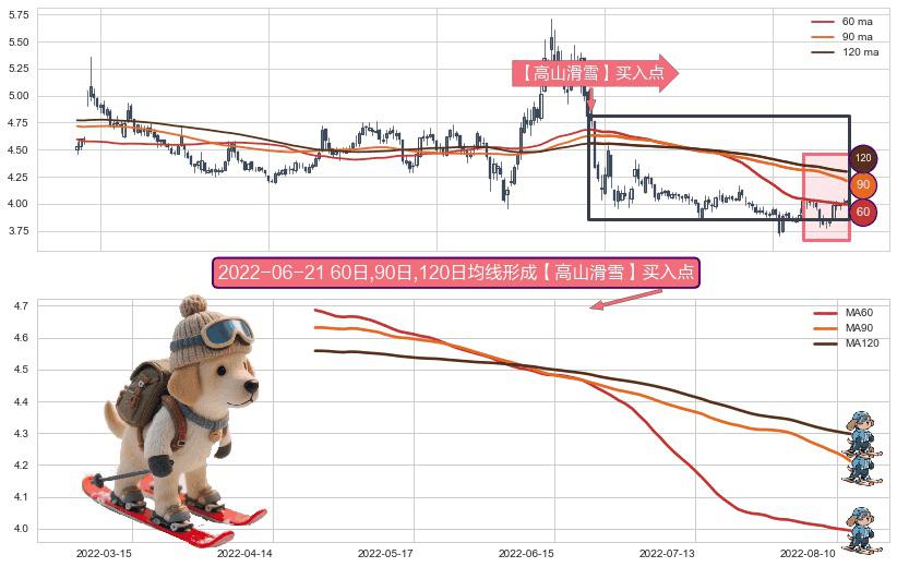 ⚀ 2022-04-22日-2022-08-12日显现 60日-90日-120日均线 【高山滑雪】买入点 看多信号,后市看涨,买入